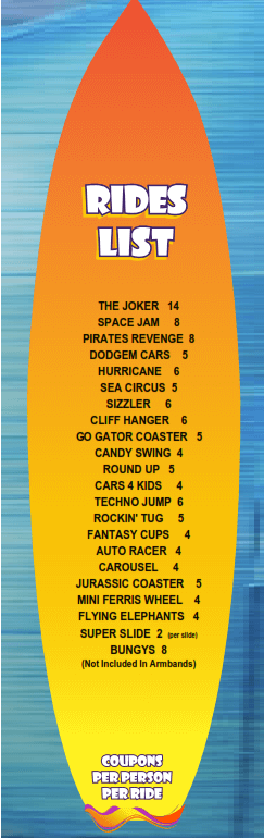 Coupons required are listed beside each ride below. No coupons are required should you hold an armband