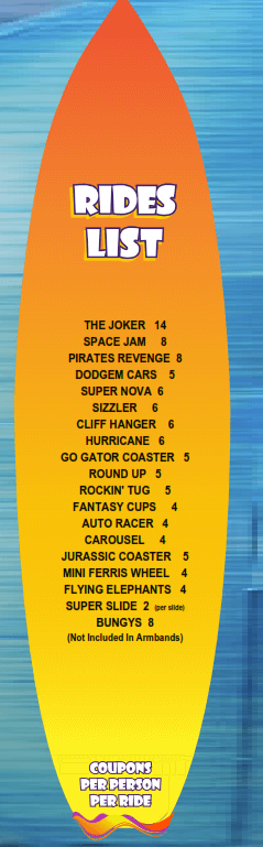 Coupons required are listed beside each ride below. No coupons are required should you hold an armband